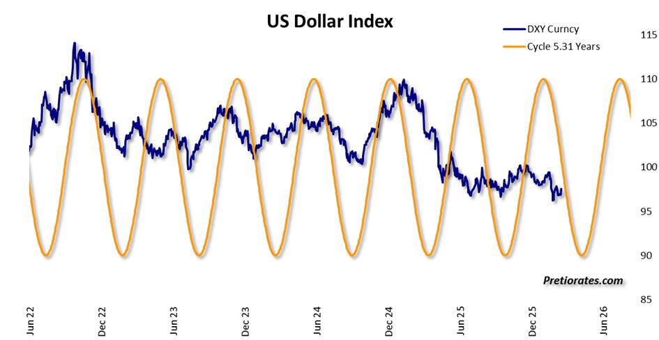 The US Dollar also follows a 5.31-year cycle, which has provided astonishingly accurate signals in the past. According to this rhythm, the greenback is likely to experience something of a fresh spring in the coming months.