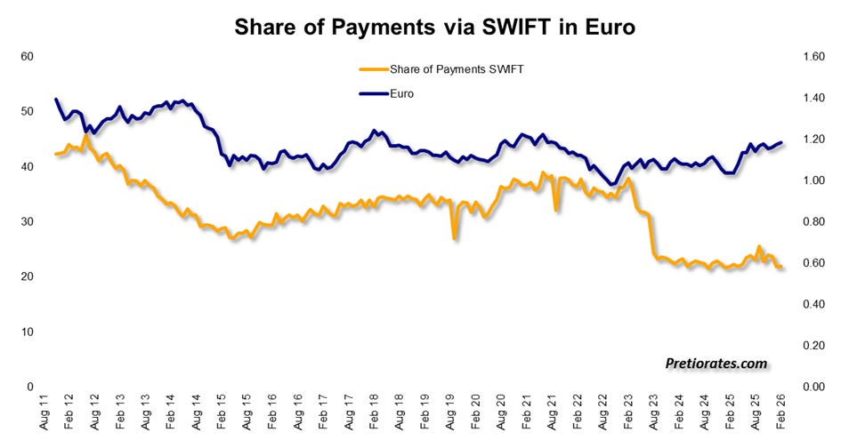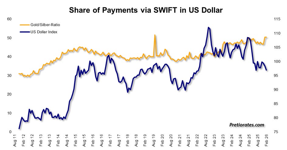 SWIFT, the central nervous system of international payments, has just published its latest transaction figures for various currencies. And lo and behold—the number of transactions in US Dollars jumped from 46.77% to 50.49% between November and December. A remarkable leap. We suspect that this could have something to do with the rise in precious metal prices.