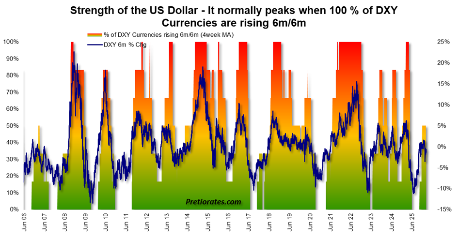 When a currency rises, it is not necessarily due to its own strength. Sometimes it is enough for the competition to weaken. This is exactly what the next chart shows: the other currencies in the Dollar basket are once again showing signs of fatigue. And when the others stumble, the Dollar automatically stands a little taller...