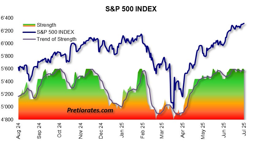 The inner strength of the S&P 500 remains impressive. It shows where we are, not where we are going – and is therefore a very important input. And it tells us that we are currently in dark green territory...