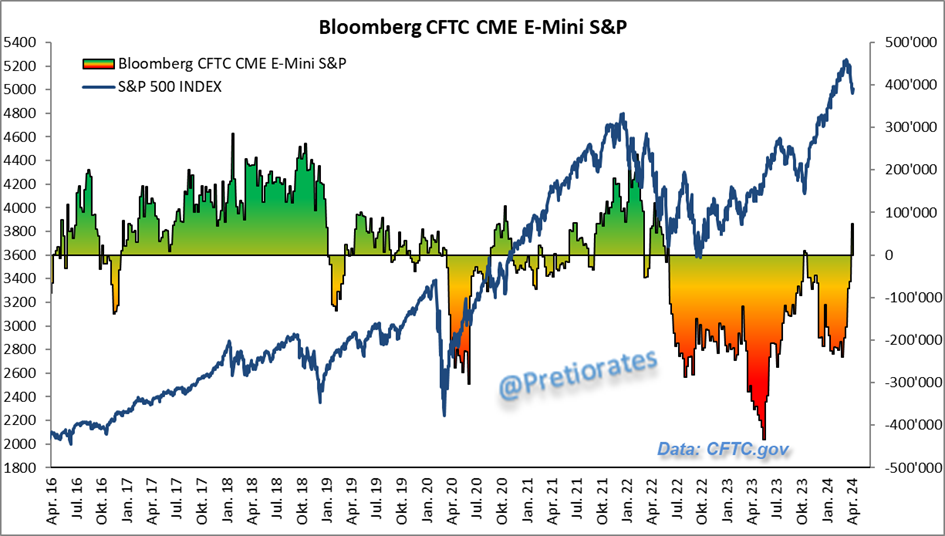 The short positions in the S&P500 were also fully covered and for the first time since July 2022 (!) the 'non-commercials' (institutional financial investors such as funds) are net long in the S&P500 again... (BTW: The short positions could also have been hedges to hedge portfolios. Would mean that investors have become very (or too) bullish again...