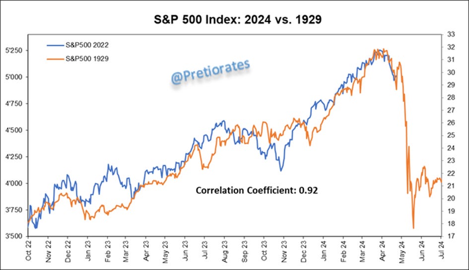 History never repeats itself, but it often rhymes... This Fractial-Chart is not really meant seriously, but the extremely high correlation of +0.92 between the movements of 1929 and the current one is quite overwhelming...