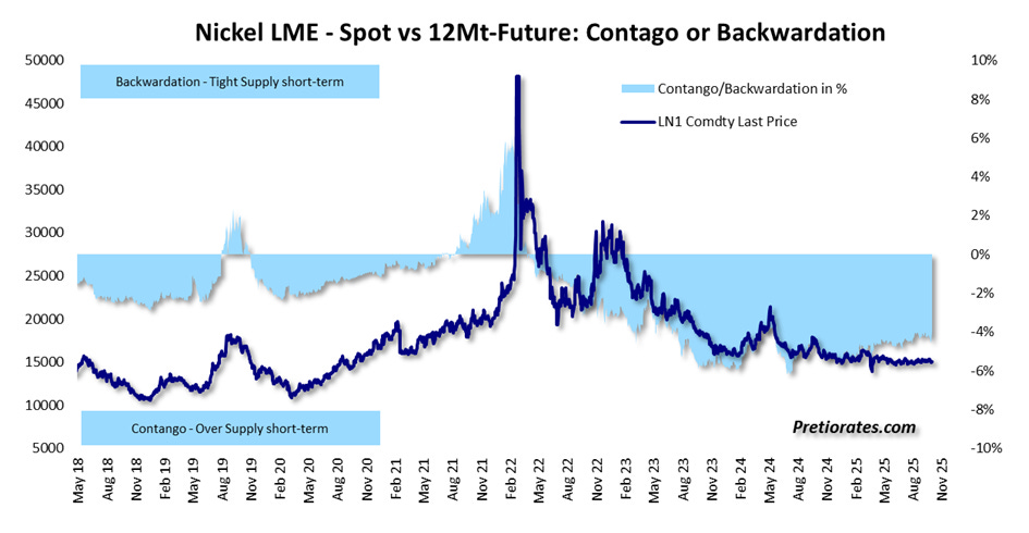 The situation is quite different for nickel. After the price shock three years ago—when delivery obligations could no longer be met in futures trading—things have been quiet there ever since. Indonesia flooded the world market with cheap nickel, creating a historic oversupply. The price decline was correspondingly severe, and the forward curve slipped deep into contango. But smart investors are already sensing an opportunity: international pressure on Indonesia is growing, and the reckless exploitation of nature and resources is unlikely to continue indefinitely. As soon as the Indonesian government places greater emphasis on sustainability again, supply will stall. The nickel price – and with it the shares of mining companies – could take off strongly with this long-term outlook.