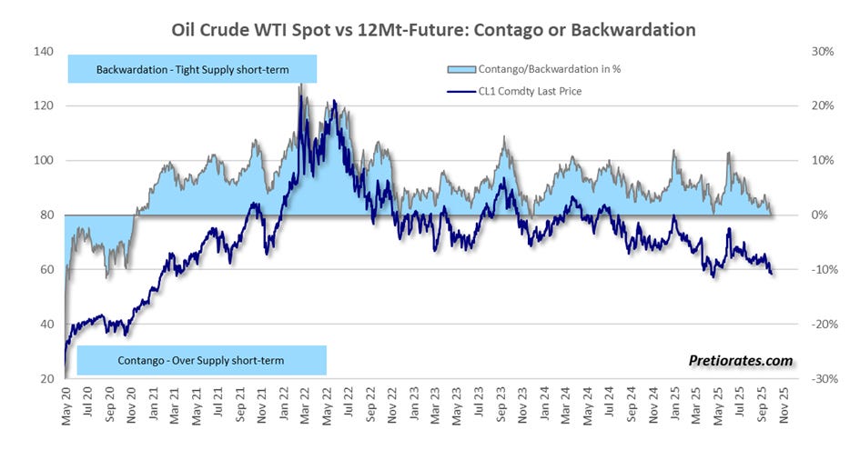 The futures market reveals a similar picture. In a so-called contango situation, prices for later delivery dates are usually above current spot prices – a sign of sufficient supply in the spot market. But for four years now, the opposite has been true: backwardation, where the spot price is above the futures price, reflecting a tight market for immediately available oil. The OPEC+ production cuts caused this situation, but did not lead to rising prices. As the production cuts are now being phased out again, backwardation seems to be coming to an end – which, based on experience, is not a good omen for the oil price.