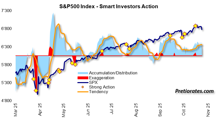 Smart investors operate in the background – their traces are not directly visible in the index. The light blue area in the chart shows whether they are accumulating or distributing, while the orange line shows the trend. Since spring of this year, the “smart” investors have been steadily accumulating.