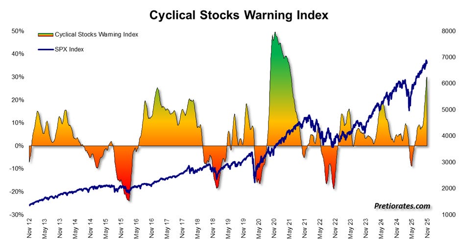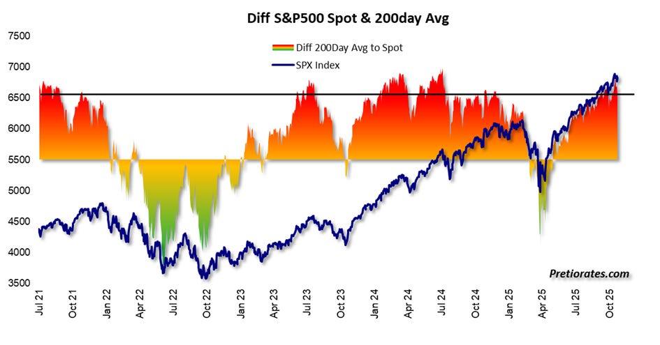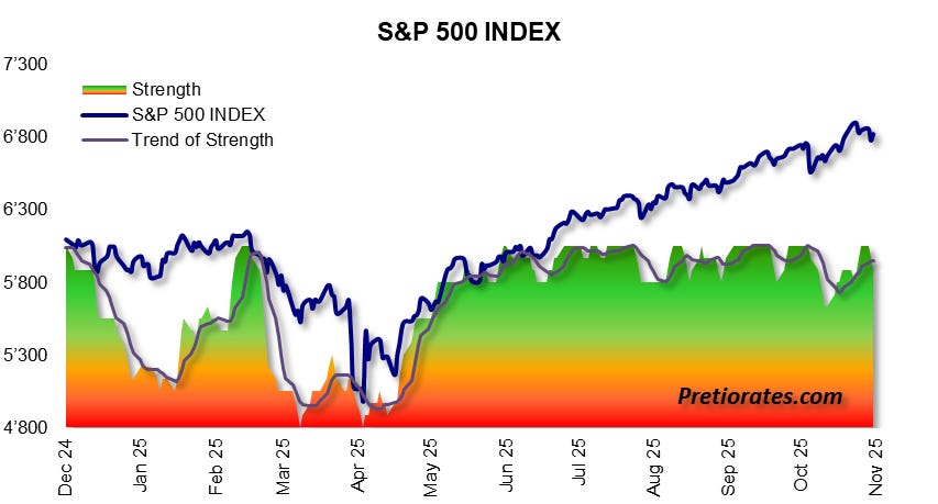 In addition to our own indicators, we also use classic analysis tools. They show that since “Liberation Day” in April 2025, the S&P 500 has reached a key target – two upward waves, interrupted by a correction in May. The third wave is now moving close to the 100% extension target at 6,901 points. However, the new highs have not been confirmed by the Relative Strength Index (RSI) – a warning signal highlighted by the blue line. It is a sign of waning strength.