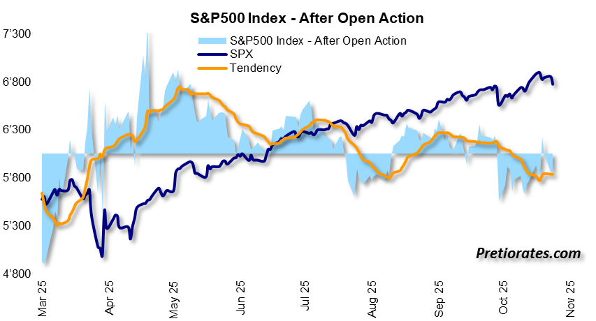 The “After Open Action” chart shows how short-term traders and speculators are behaving. The light blue area slipped into negative territory in October – a clear sign that positions were being reduced or sold.