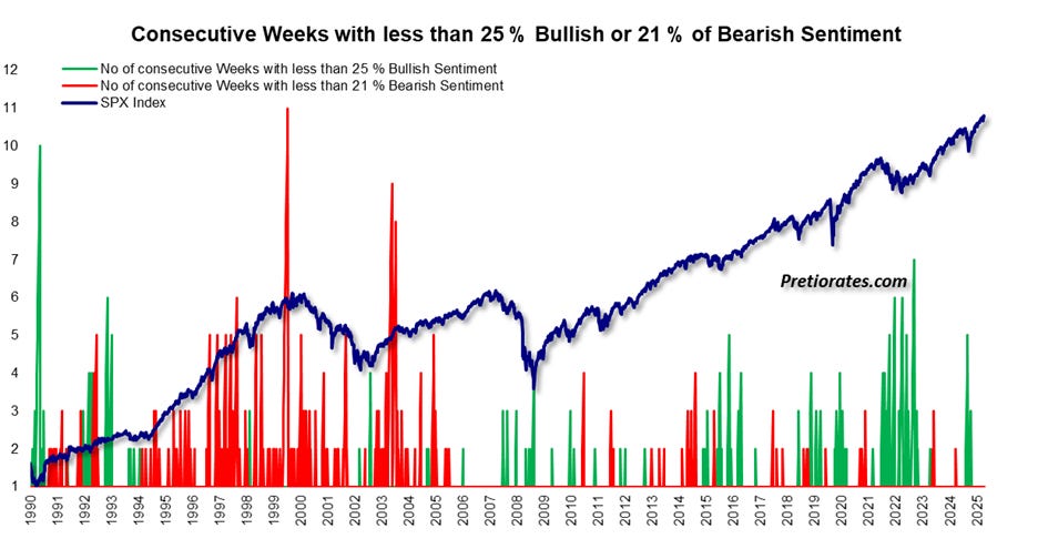 On the contrary: most investors are currently acting so cautiously that this is almost a bullish signal – marked in green on the chart. Those who have already sold cannot generate any further selling pressure, but have liquidity available to re-enter the market when sentiment improves.