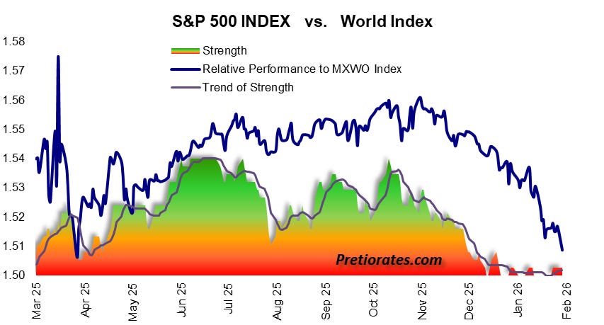 Even if the broad S&P 500 appears stable at first glance, this stability is deceptive. Since November 2025, it has significantly underperformed the global stock index. Little remains of the locomotive of all financial centers. It is more like a wagon that can be pulled along.
