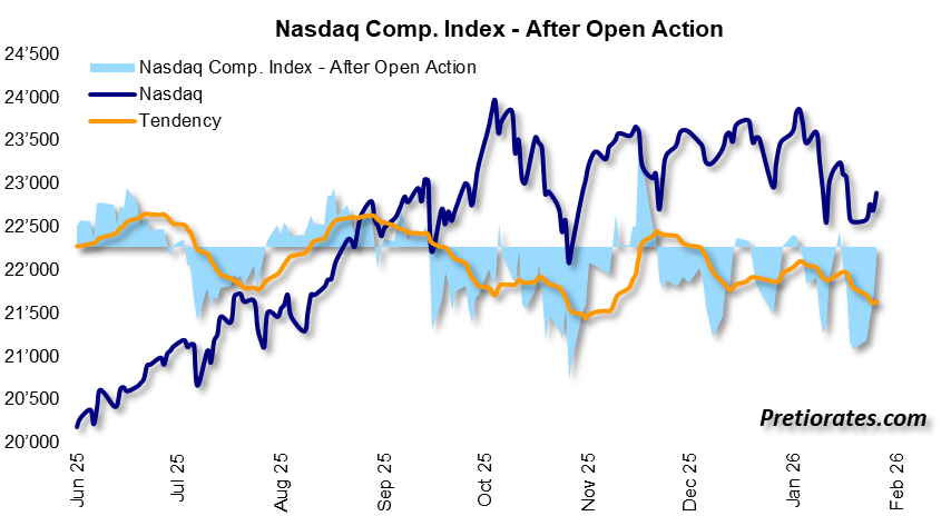 A clearer picture is provided by After Open Action (AoA), which reflects the actual activity of traders. And here, the Nasdaq Index in particular is showing a significantly weaker picture. Since the fall, positions have been reduced in the background – quietly but steadily.