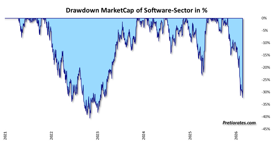 First, it hit the Magnificent Seven, the former darlings of every presentation. Then came the software stocks. Our own index of US software stocks has already lost over 30% since the end of 2025. And as we noted in one of our recent issues of Thoughts: It is still too early for bottom fishing. The waters are not calm enough yet.