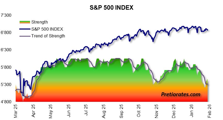 It has been almost exactly a month since we pointed out that the inner strength of the US stock market no longer looks quite so fresh. In our Thoughts on January 21, 2026, we speculated whether rising interest rates in Japan could be the domino that would fall – or whether SCOTUS might rule US import tariffs illegal. In the end, the trigger for a correction is actually secondary. The key thing is whether you are prepared when the first domino falls.
