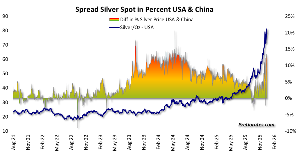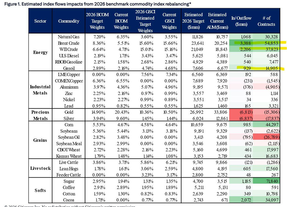 The rebalancing of the two commodity indices, Bloomberg BCOM and Goldman Sachs GSCI, has begun and will continue until January 18. Several hundred billion dollars in assets are based on these benchmarks. Due to the sharp rise in gold – and silver in particular – precious metals have achieved a massive overweight in portfolios, which will now be reduced within about ten days. Citigroup estimates that around 17,837 futures contracts will have to be sold in the silver market alone.