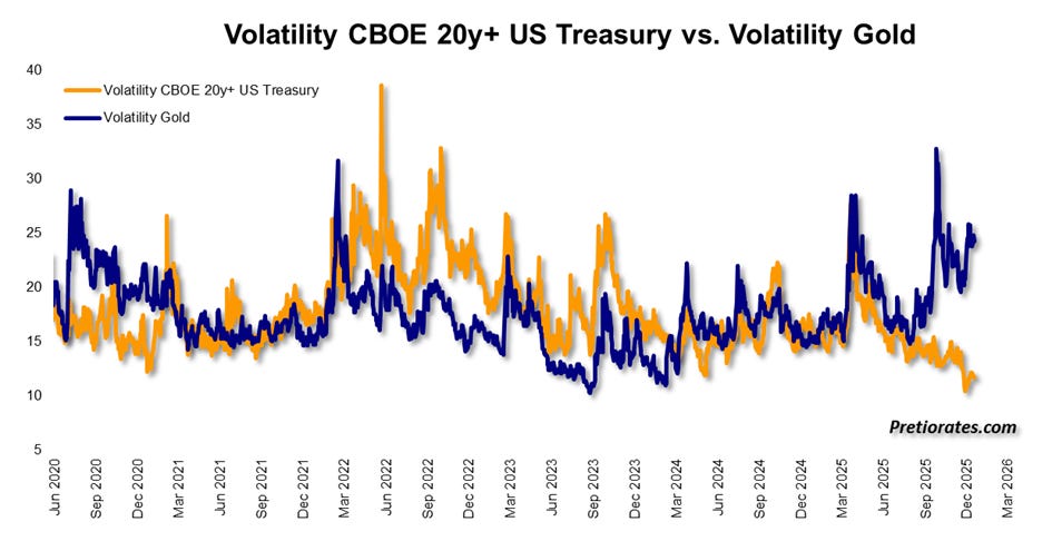 For obvious reasons, the volatility of gold and bonds tends to run fairly synchronously. Gold has fluctuated significantly in recent months, sometimes erratically – a classic signal of impending major changes. After all, uncertainty is the key selling point for gold.